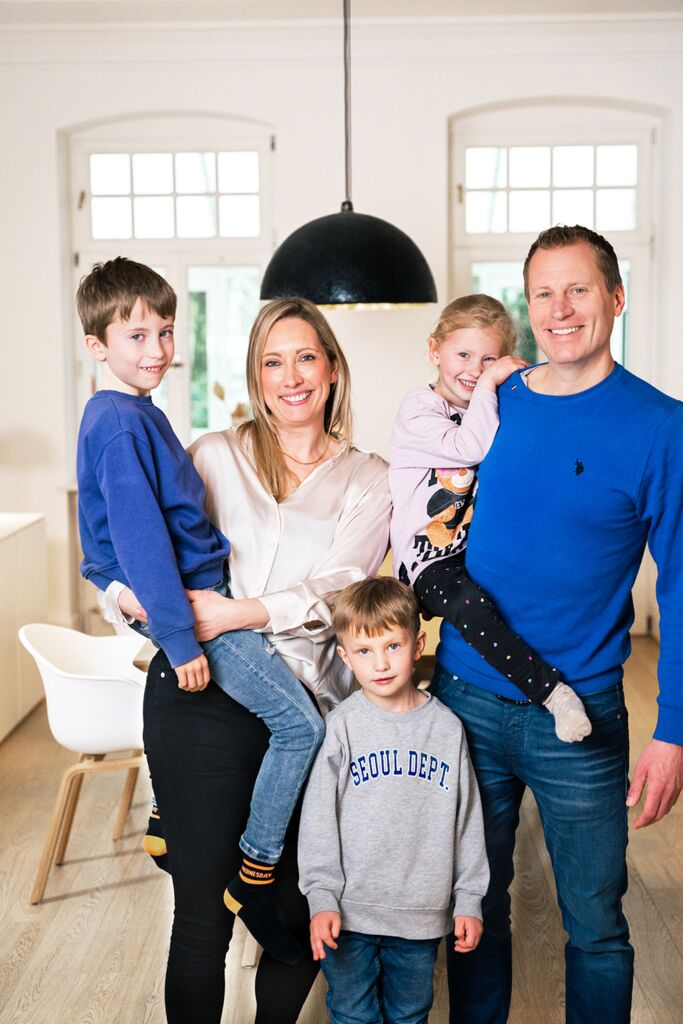 Und es stimmt: Das moderne Haus mit seinem weitläufigen Eingangsbereich lädt zum Wohlfühlen ein. Vergessen sind die ein oder andere Herausforderung wie die Finanzierung oder der Termin beim Amt für Denkmalschutz. Bis die beiden wussten, ob es überhaupt klappt, habe es ungefähr zwei bis drei Monate gedauert, „von der initialen Kontaktaufnahme über die Finanzierung und bis dann auch der Notartermin feststand“, erklärt Fabian. Letztendlich ging es bis zum Baustartschuss aber doch relativ schnell: Fabian wuchs im Nebenhaus auf und kannte sowohl das Haus als auch die Nachbarn sehr gut. Eine glückliche Fügung, denn als die Vorbesitzer auszogen, haben sie zuerst Sabrina und Fabian gefragt – dadurch kam das Haus gar nicht erst auf den Markt – und die beiden konnten sich in aller Ruhe für die vertraute Gegend entscheiden, ohne dass sie sich mit Maklern und anderen Interessenten herumschlagen mussten. Nach der ersten Kontaktaufnahme im Mai 2021 ging es in die Finanzierungsphase. Anschließend fand im Juli der Notartermin statt und nach den Sommerferien war Baubeginn. Und schon im Dezember 2021 konnten Fabian, Sabrina und die drei Kinder ihr erstes Weihnachtsfest im neuen Haus feiern. Seit Ende Januar 2022 ist nun endlich alles komplett fertiggestellt.
